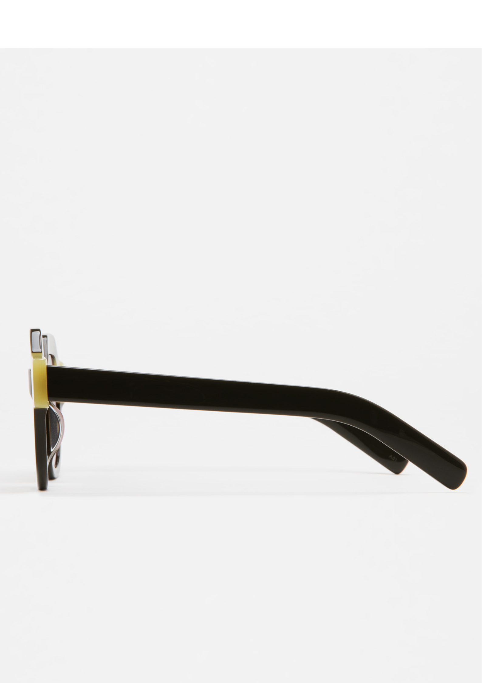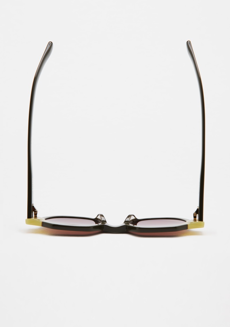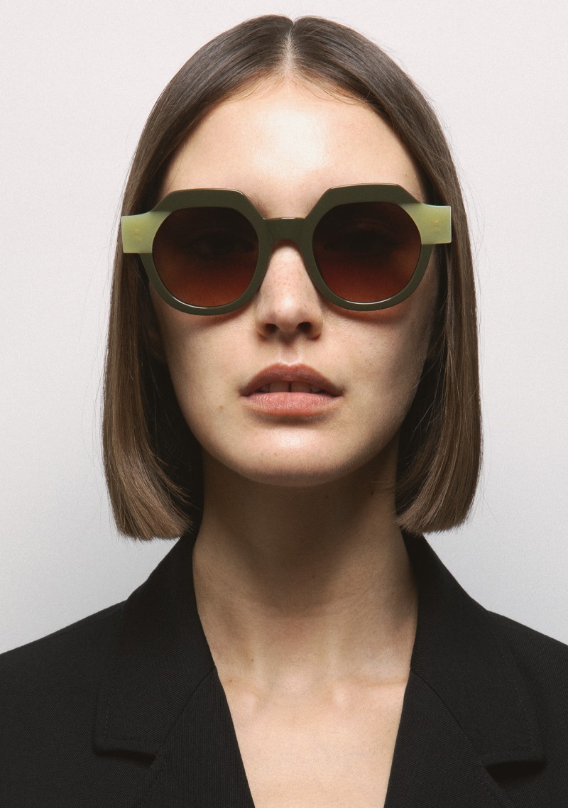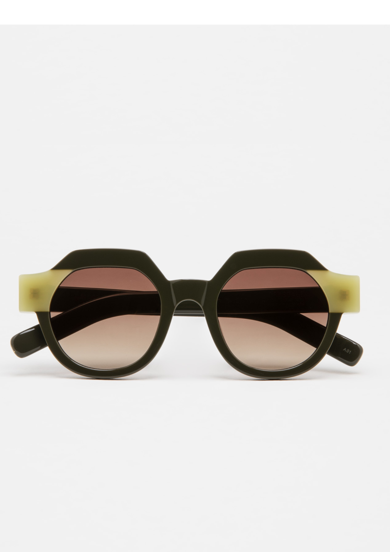 Gafa de sol fabricada en acetato color verde oscuro con laminado verde claro . Forma redondeada con un diseño que destaca por el talón pronunciado y de distinto color que el frontal de la gafa . Lentes tintadas en marrón degradado con tratamiento antireflejante por la cara interna . Protección 100% UVA/UVB . Dimensiones 48-22/145