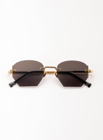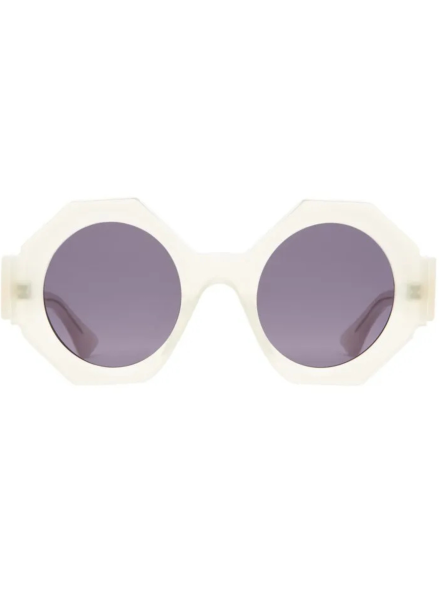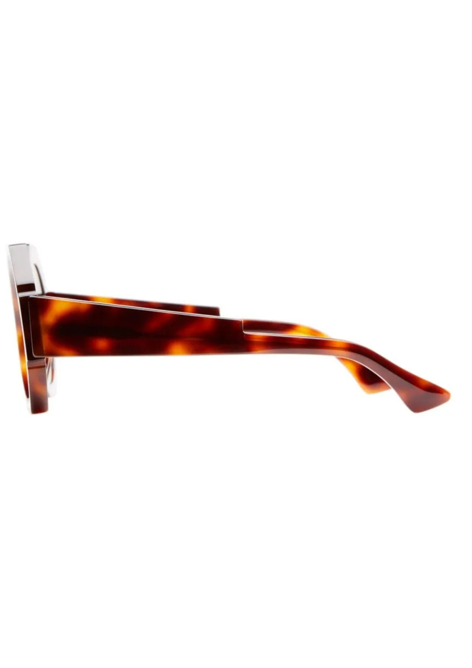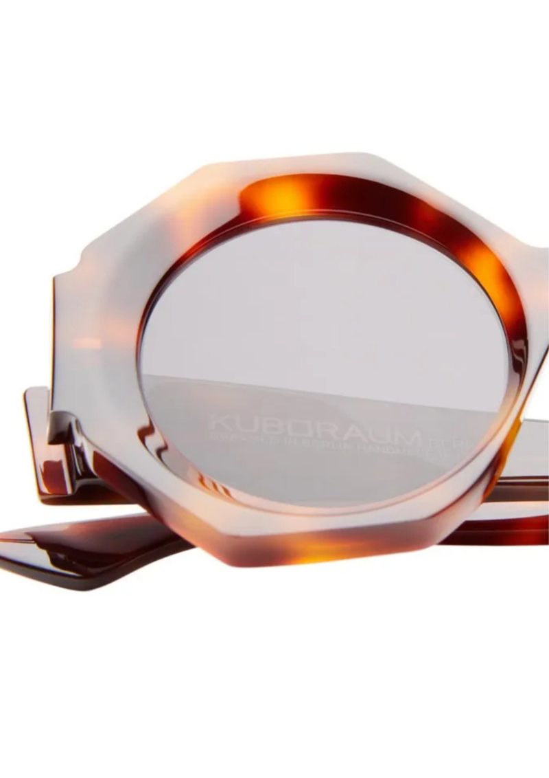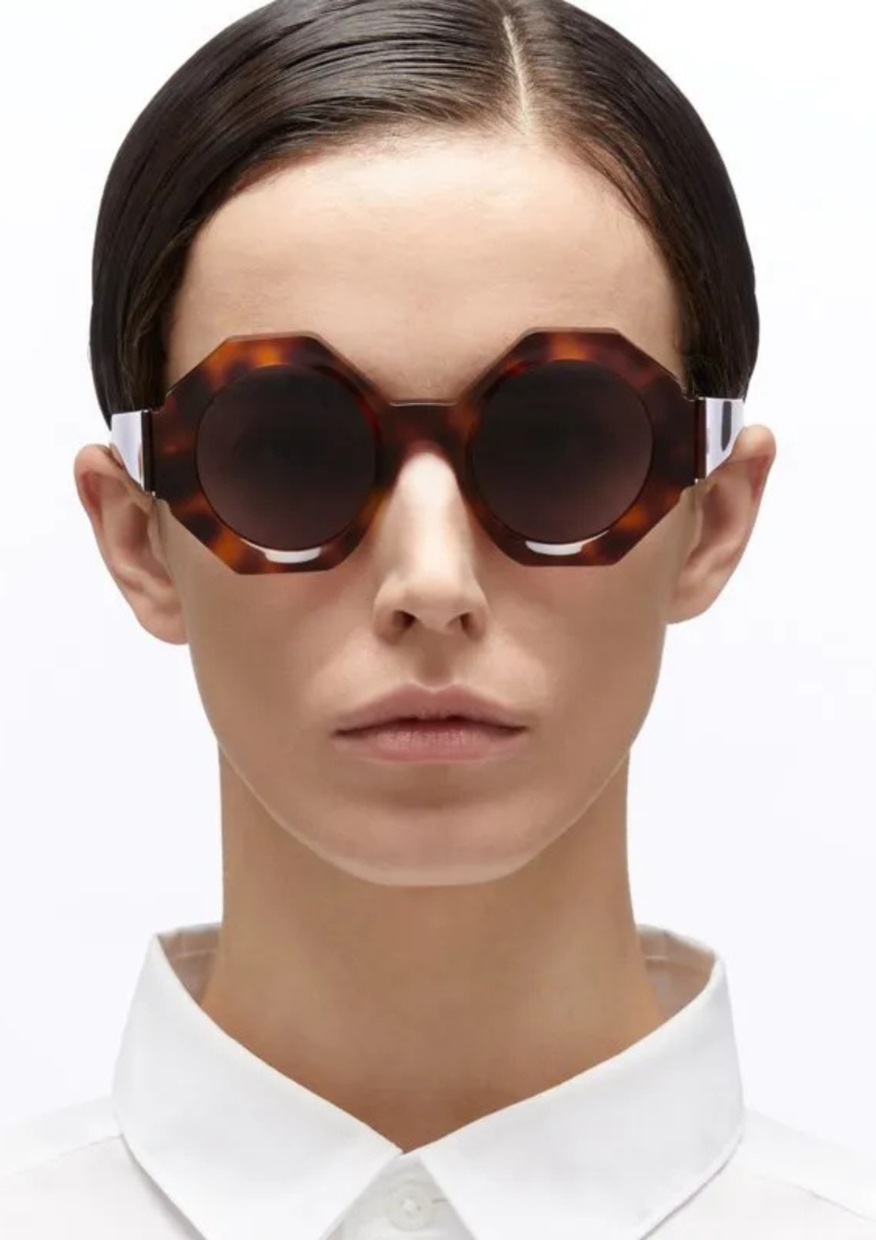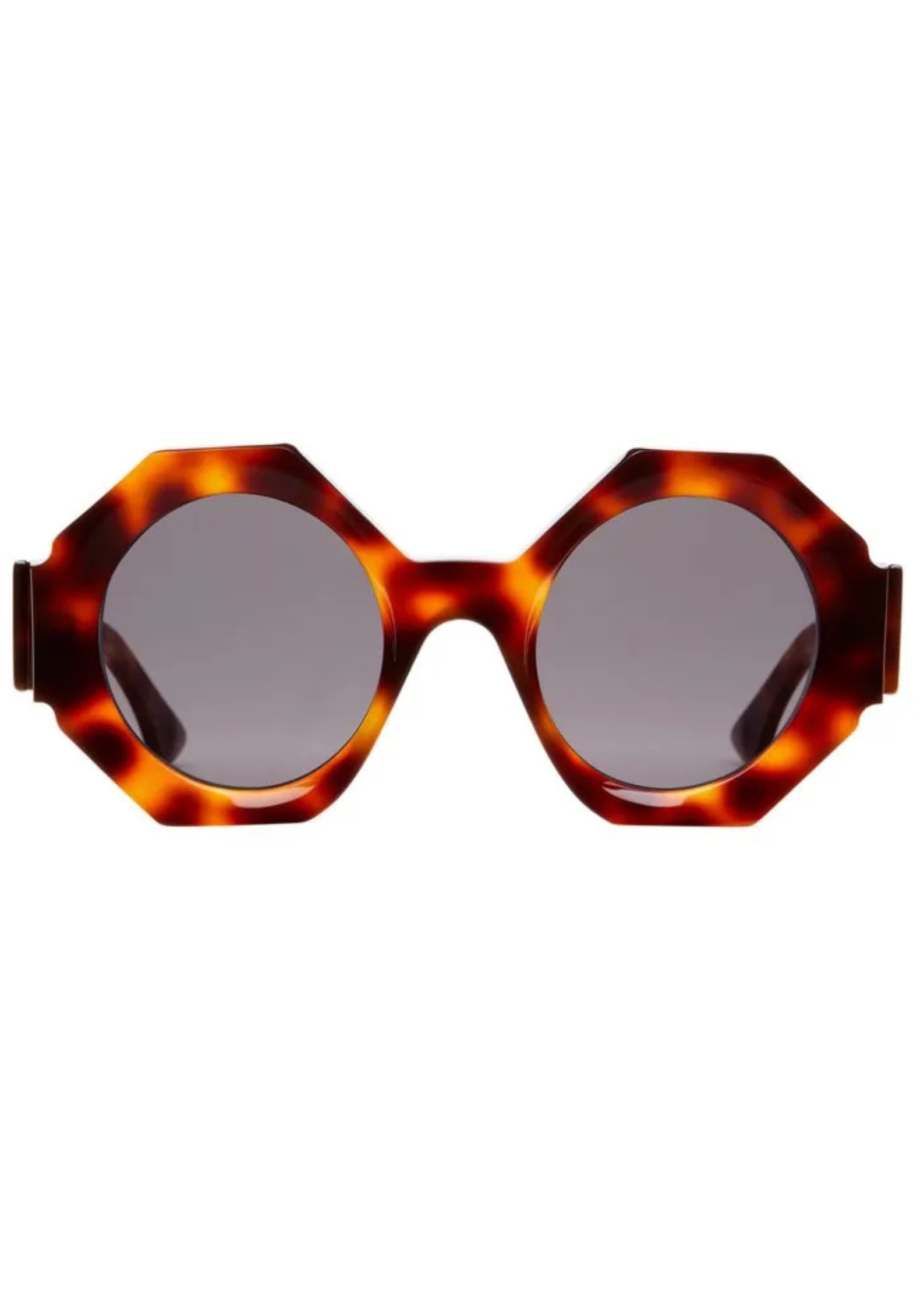 Gafa de sol fabricada a mano en acetato color carey . Forma geométrica redondeada . lentes tintadas en color gris con antireflejante por la cara interna . Protección 100% UVA/UVB . Dimensiones 47-23/145