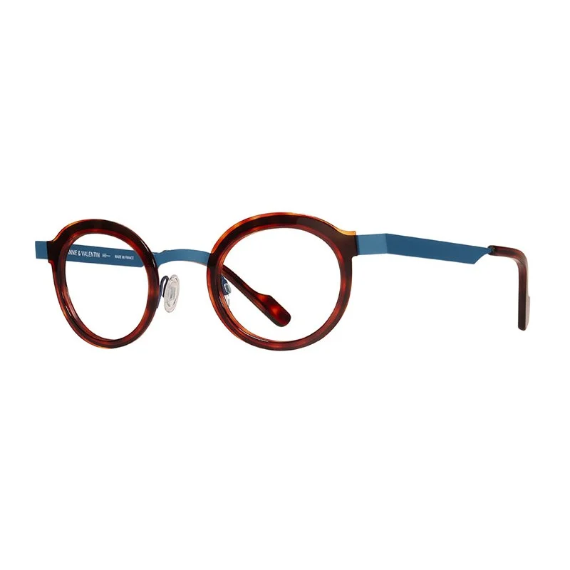 Montura fabricada en acero inoxidable color azul combinada con aros en acetato marrón . Forma redondeada pequeña , muy ligera y confortable . Dimensiones 42-24/145
