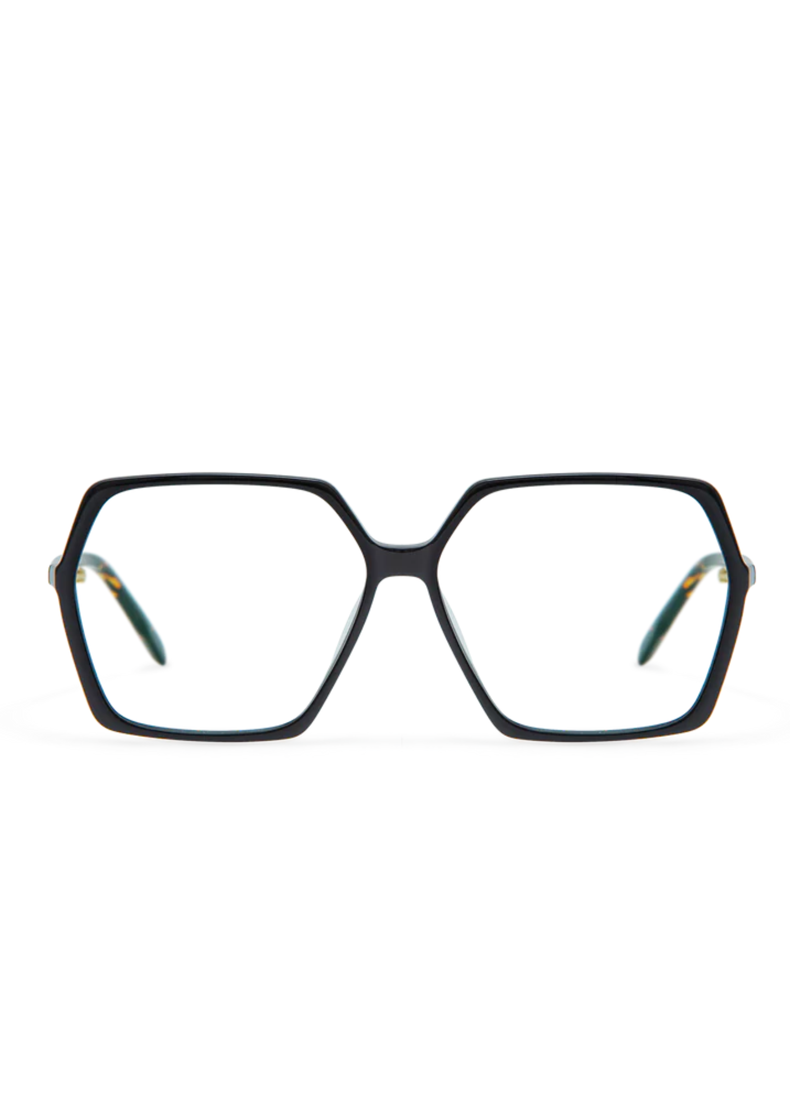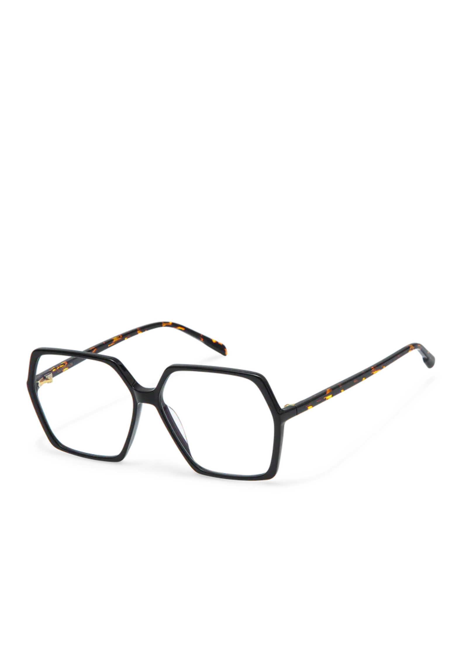 Montura femenina fabricada en acetato negro con varillas carey finas . Forma cuadrada oversize , muy ligera y confortable . Dimensiones 57-13/140