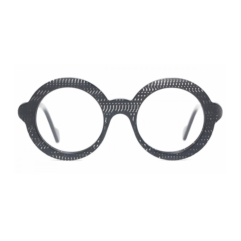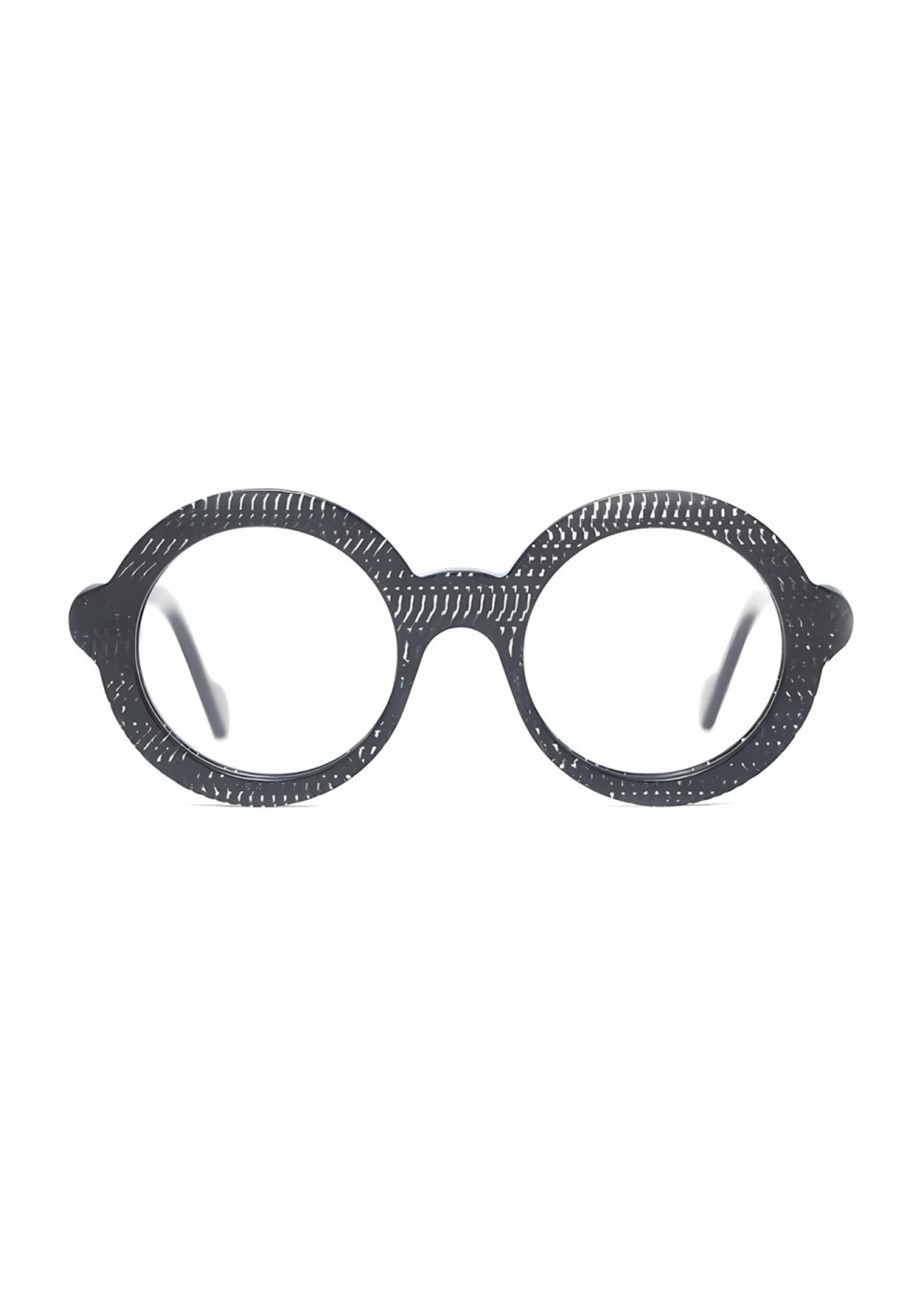Montura unisex fabricada artesanalmente en acetato color negro y cristal , esta combinación de color hace que la montura brille según incida la luz . De forma redonda , la firma belga combina la funcionalidad con diseño y artesanía de vanguardia . Dimensiones 46-21/145