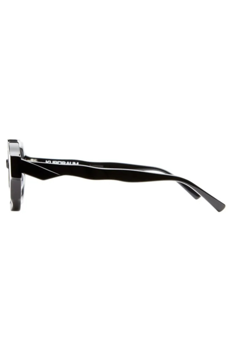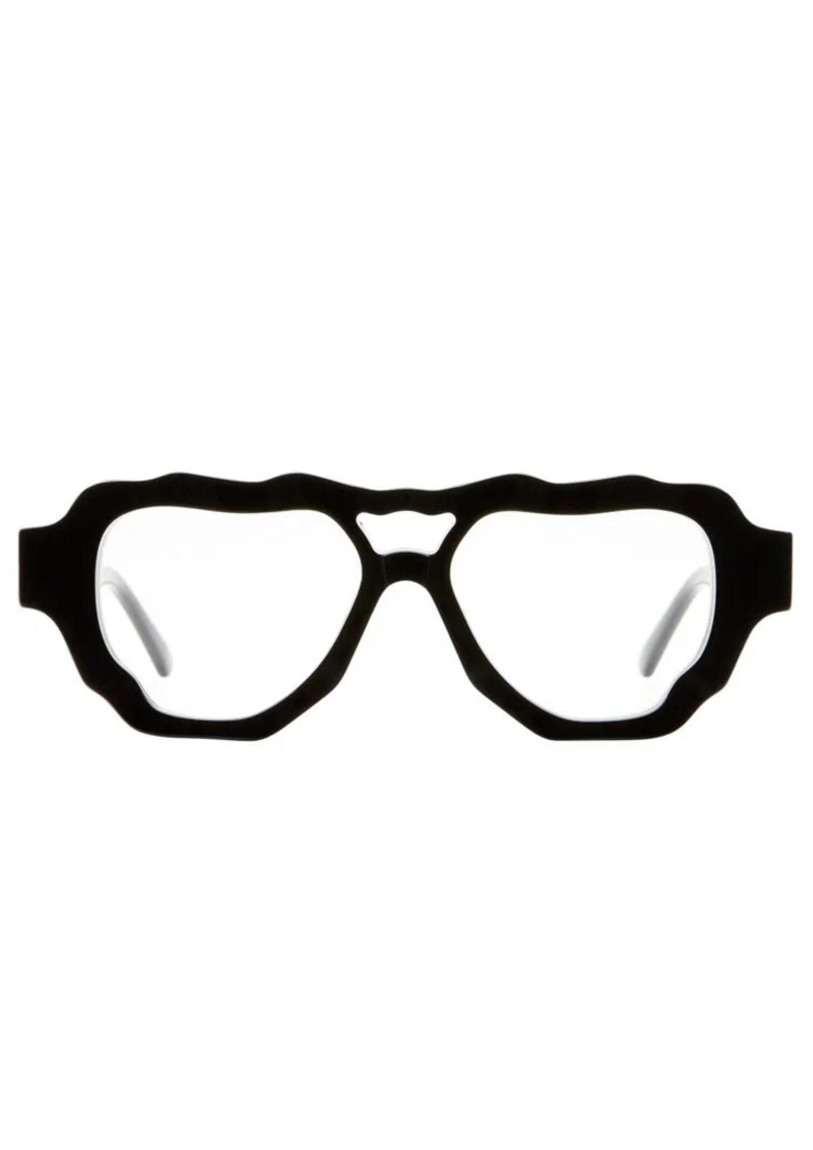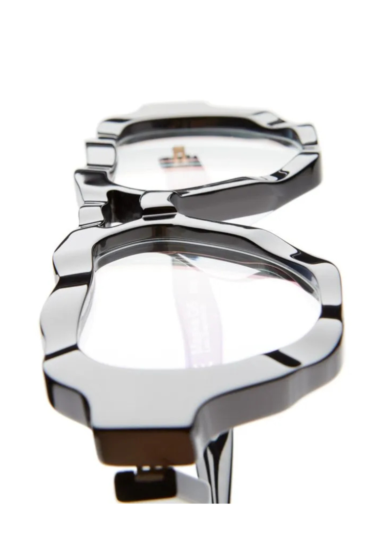 Montura fabricada a mano en Italia en acetato color negro brillante . Forma aviador con contornos irregulares , una de las últimas propuestas de la firma berlinesa . Dimensiones 51-15/145