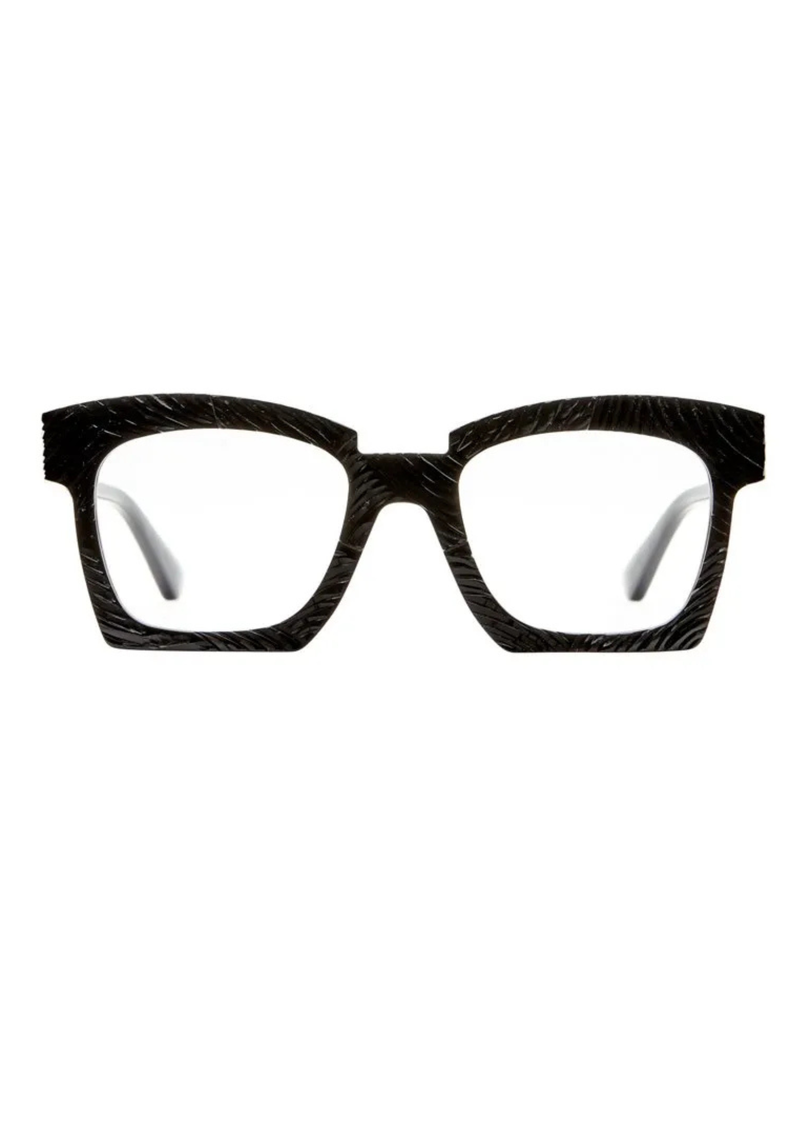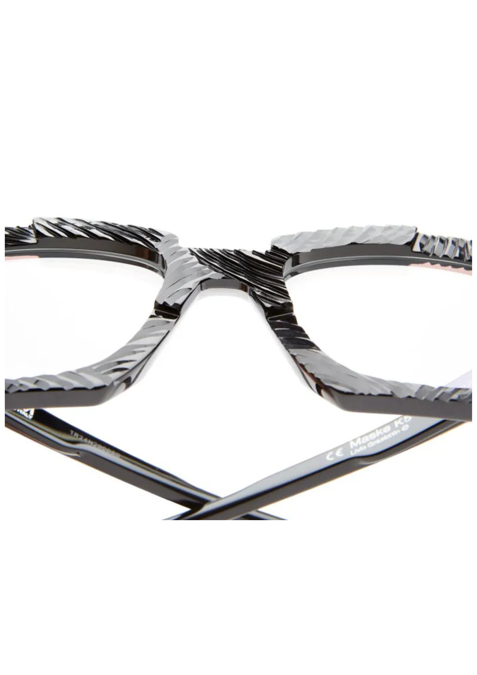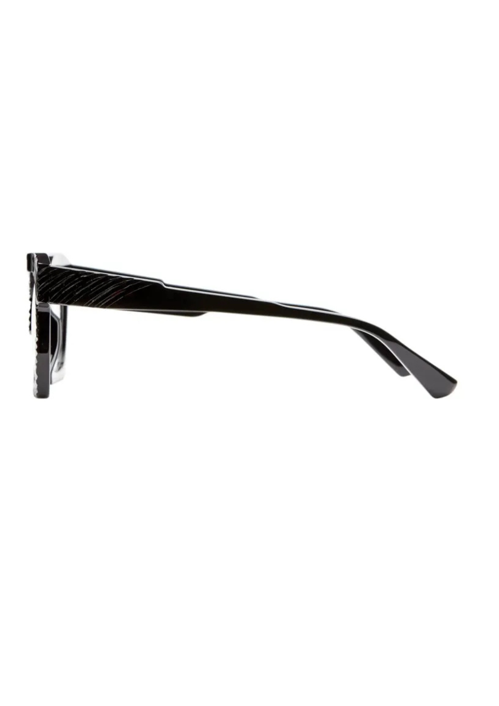 Montura fabricada en acetato negro , la superficie se trabaja a mano para dar ese brillo particular. Forma cuadrada con relieve , un icono de la firma berlinesa . Dimensiones 51-20/145