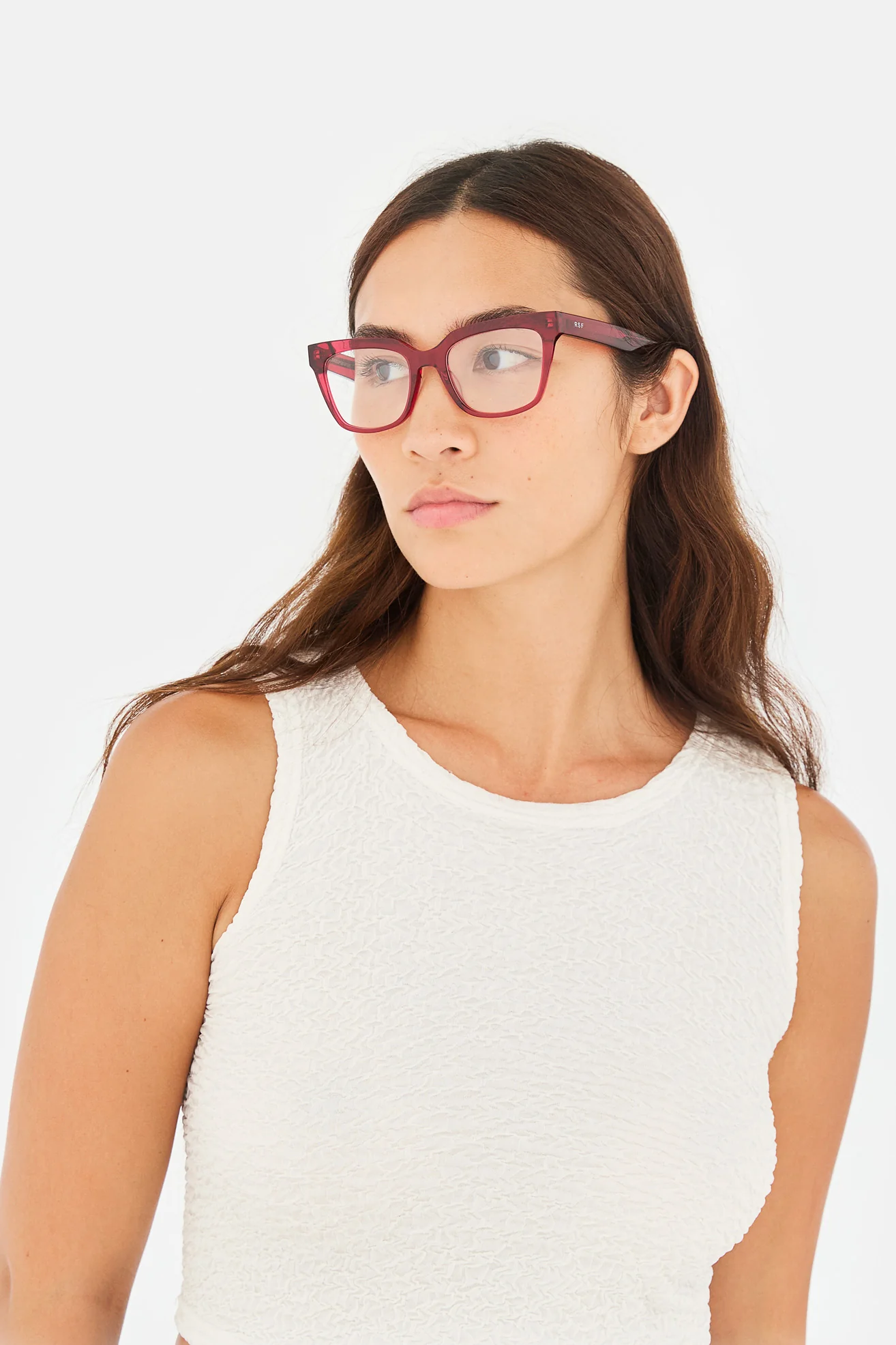 Montura femenina fabricada en acetato  color burdeos  . Forma cuadrada con ligero toque cat-eye . Dimensiones 52-19/140